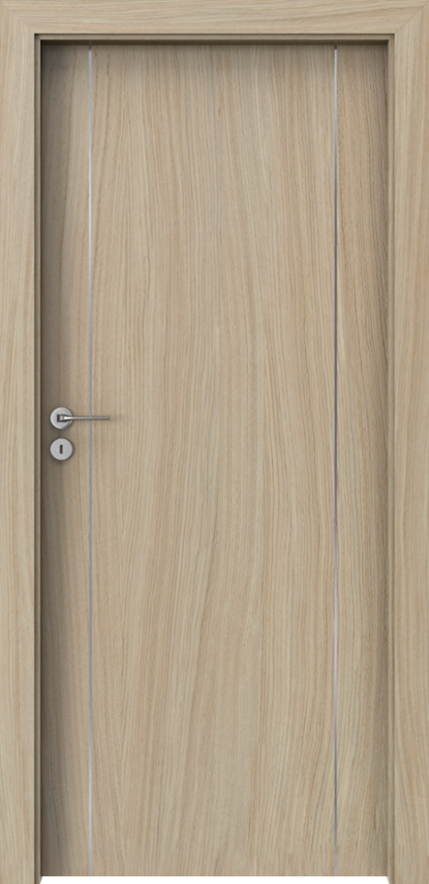 NATURE LINE е интериорна врата с естествен фурнир и характерни декоративни инкрустации с ширина 6 mm в сребрист, златист или черен цвят. Линеен акцент, който подчертава формата на крилото без да я претоварва.